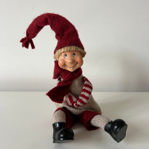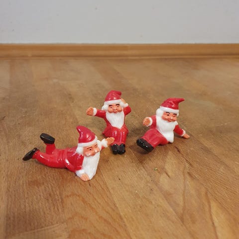 Plastik nisse med gave i hånden.H 5 cm.Flot og velholdt, gå til varen for flere billeder.(Julepynt 6)