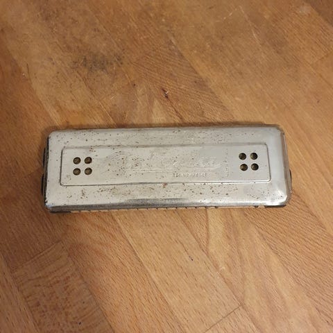 Golden Melody mundharmonika.H 5,5 cm, L 16 cm.Gå til varen, for flere billeder.(Reol 6 - fletkurv).