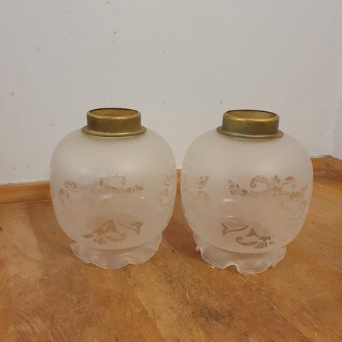 Retro lampeskærme i glas.H 14 cm, Dia bund 4 cm, Dia top 4 cm.Har 2 stk på lager, prisen er stykket. Gå til varen, for flere billeder.(Reol 8).