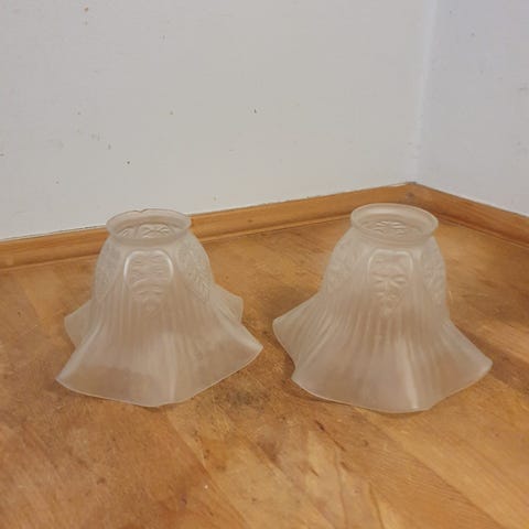 Lampeskærm i glas.H 8 cm, Dia top 4,5, Dia bund 19 cm.Har 6 stk på lager, prisen er stykket. Gå til varen, for flere billeder.(Reol 8).
