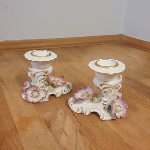 Vintage lysestage i porcelæn til kronelys.H 26 cm, B 16 cm.Har skår, gå til varen, for flere billeder.(Reol 1).