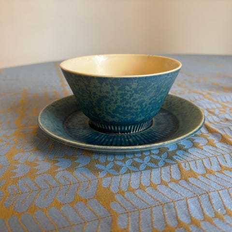 Knabstrup kop/underkop i keramik.Kop H 6 cm, Dia 10 cm.Underkop Dia 15,5 cm.Har 4 sæt på lager, alle velholdte. Prisen er stykket. Gå til varen, for flere billeder.