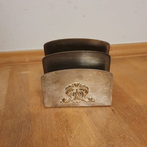 Servietholder i pletsølv.H 7 cm, B 13 cm.Flot og velholdt, gå til varen, for flere billeder.(Reol 6 - Fletkurv).