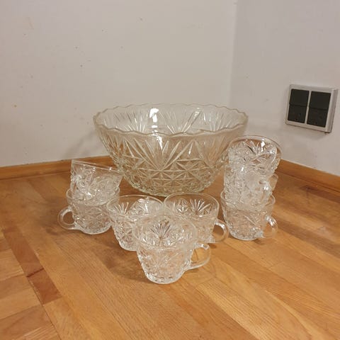 Vintage bowle med 12 glas.Bowle H 21 cm, Dia 25 cm.Kop H 6 cm, Dia 7 cm.Flot og velholdt, gå til varen, for flere billeder.(Loftet).