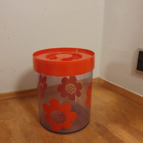 Erik Kold dåse med orange blomster.H 22 cm, Dia 17,5 cm.Flot og velholdt, gå til varen, for flere billeder.