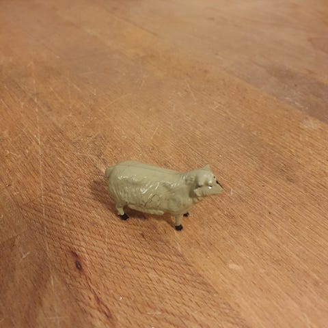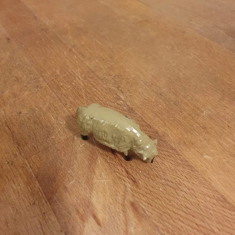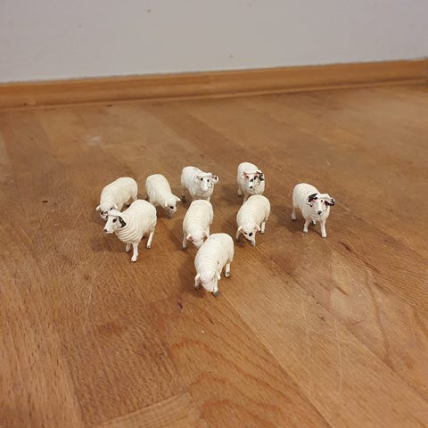 2 får, L 3 cm, H 2,5 cm.J. Hill & Co, England.Plastik legetøj.Gå til varen for flere billeder.(Legetøj 1)