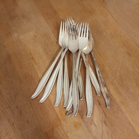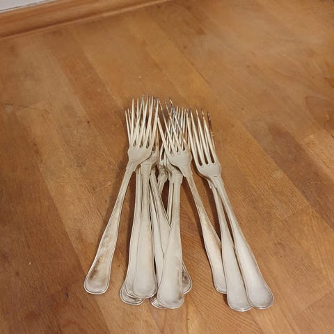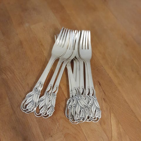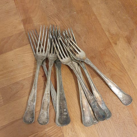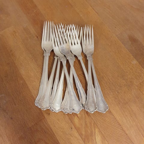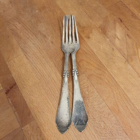 6 styks gafler i pletsølv.L 20 cm.Sælges samlet, gå til varen, for flere billeder.(Pletsølv).