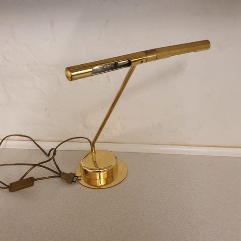 Vintage lampe i messing.1. sortering.Nr 181/2878.H 40 cm, B 14 cm.Flot og velholdt, dog plet på lampeskærm. Gå til varen, for flere billeder.(Lampe 1).