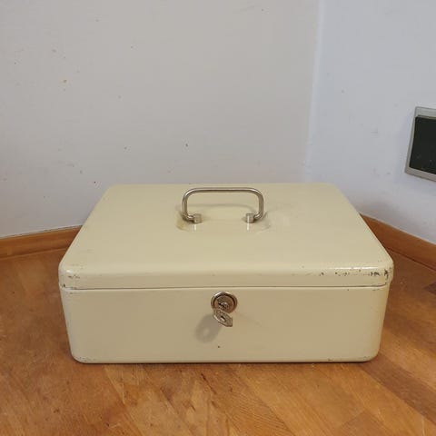 Vintage pengekasse i grønt metal med to tilhørende nøgler.H 6,5 cm, B 15 cm, D 10,5 cm.Låsen virker.