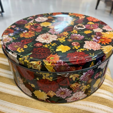 Blomsterdåse i metal.H 14,5 cm, Dia 22 cm.Velholdt, gå til varen, for flere billeder.
