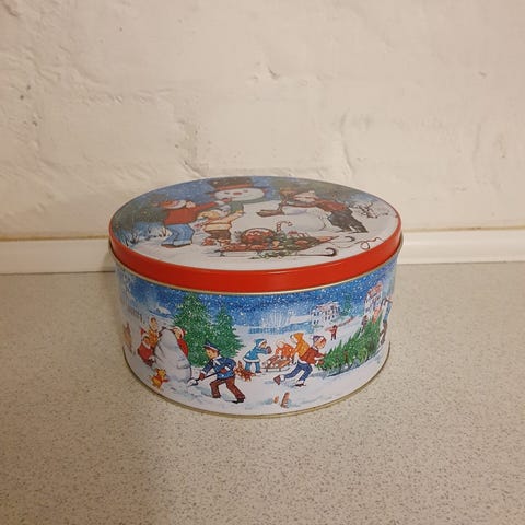 Rund juledåse.H 7,5 cm, Dia 14 cm.Velholdt, gå til varen, for flere billeder.