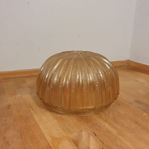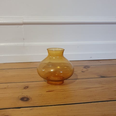 Røgfarvet lampeskærm i glas.H 15 cm, B 12 cm, Dia hul øverst 7 cm, Dia hul nederst 5 cm.Lidt skår i bund, se billede.