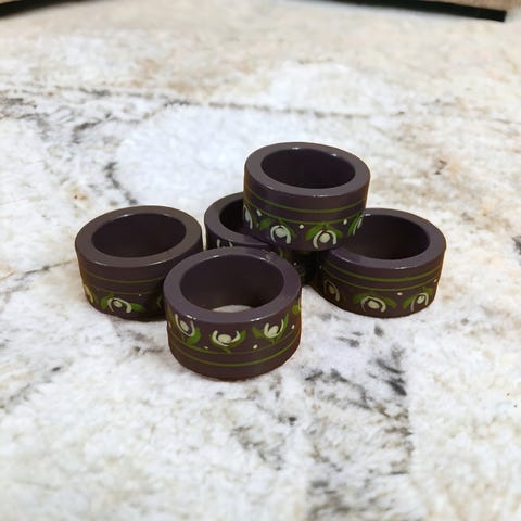 Servietringe i massivt teaktræ.H L 6,5 cm, B 2 cm.Flotte og velholdte, prisen er stykket.