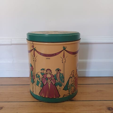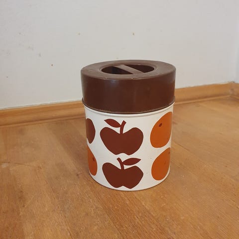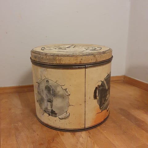 Vintage dåse fyldt med aldersrelateret patina.H 16 cm, Dia 10,5 cm.Gå til varen, for flere billeder.