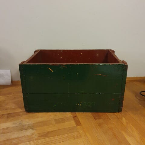 Gammel brun trækasse.Har skruehuller i hver side, se billede.H 38 cm, B 50 cm, D 28 cm.Afhentes på Nørrebro, sendes ikke.