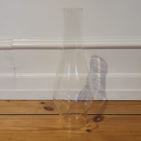 Petroleumslampe i messing med glaskuppel.H 39 cm, B 11 cm.