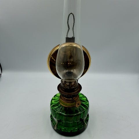 Petroleumslampe med røgfarvet glas.H 47 cm, B 12 cm.