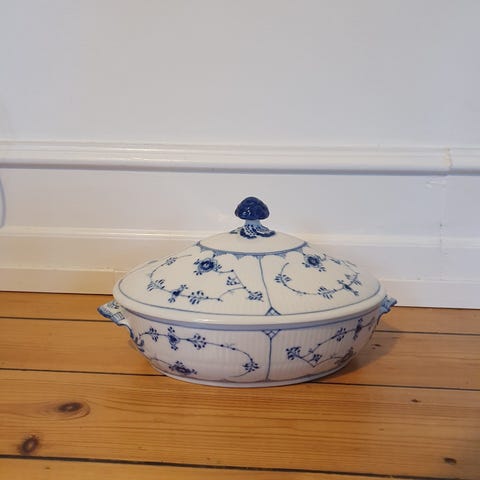 Musselmalet terrin.H 20 cm, B 33 cm, D 24 cm.Uden skår.Terrin 2. sortering, låg 3. sortering.2. sortering ses ved sort i bunden.3. sortering i låget, se billeder.Nr. 1/124.