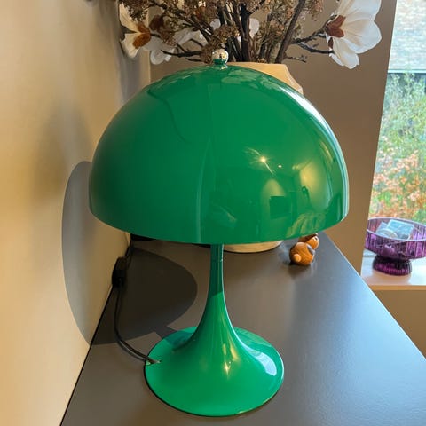 Louis Poulsen Panthella bordlampe designet af Verner Panton i krom. Lampen har en højde på 33,5 cm og er kendetegnet ved sit karakteristiske kuppeldesign og slanke fod. Velegnet til brug som dekorativ belysning på borde eller hylder.