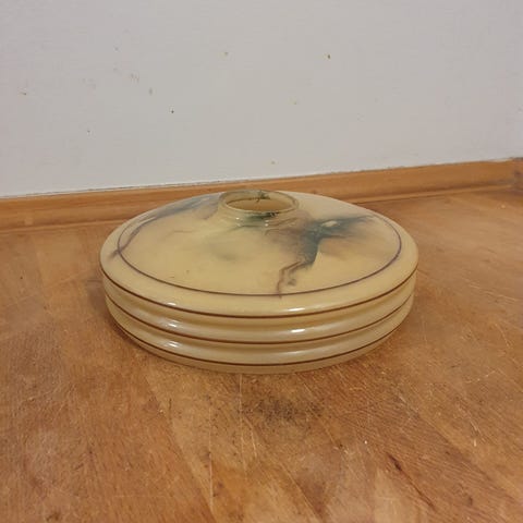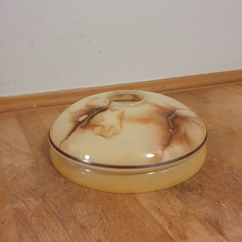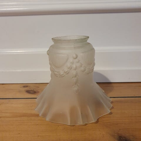 Lampeskærm med mønster i glas.H 14 cm, B 12,5 cm, Dia hul øverst 7 cm, Dia hul nederst 4,5 cm.Flot og velholdte.