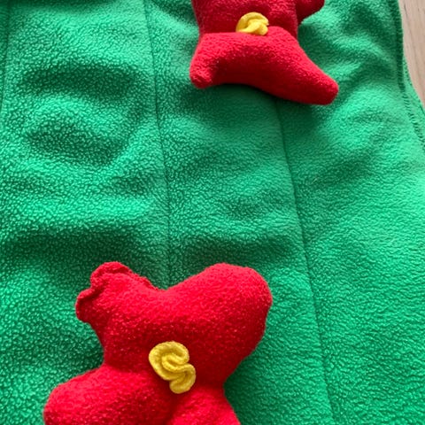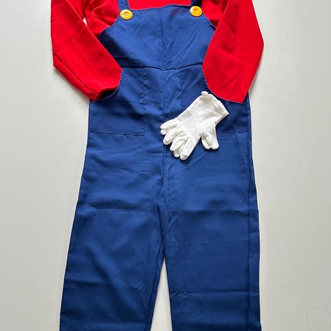 Super Mario fastelavnskustyme, tre dele: rød bluse, blå overalls og rød kasket,