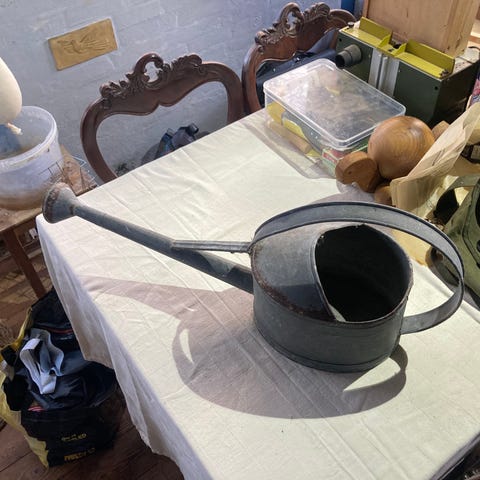 Sæt bestående af en emaljeret vandkande og en skål i cremefarvet emalje med grønne detaljer. Vandkanden har en buet tud og hank, og skålen er rund med en bred kant. Begge dele viser tegn på brug med afskallet emalje flere steder. Sættet kan anvendes til dekoration eller som funktionelt vandkar.