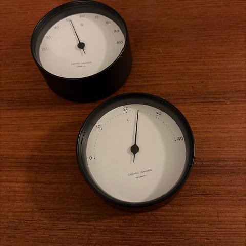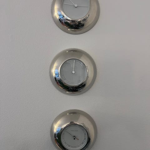 Georg Jensen Vejrstation sæt bestående af fire enheder: ur, barometer, termometer samt hygrometer. Enkelt og stilrent design. Fremstillet i rustfrit stål med glasfront.