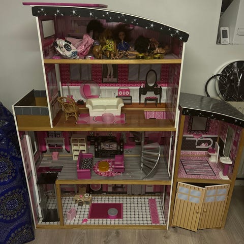 Barbie Dukkehus i hvid og sort med flere rum og møbler inkluderet. Dukkehuset har detaljer som køkken, stue og soveværelse med tilhørende møbler og tilbehør. Designet til leg med Barbie-dukker, men også Rainbowhighs.