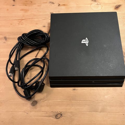 Sony Playstation 4 konsol med tilhørende controller og ekstern harddisk. Konsollen er sort og designet til gaming på Playstation-platformen.