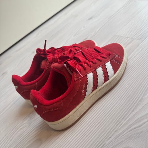 Sneakerne har røde snørebånd, et par ubrugte hvide snørebånd følger med.