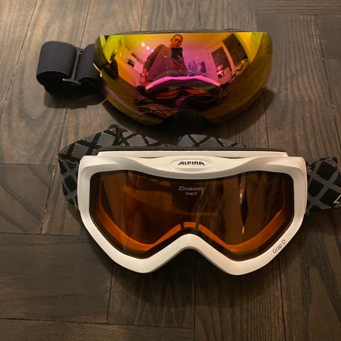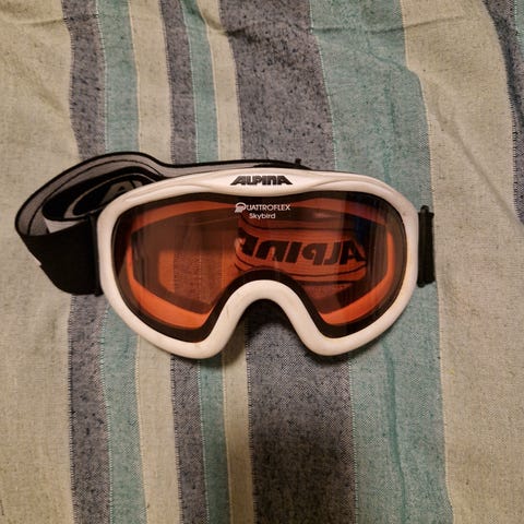 Alpina skibriller med rød ramme og orange linse. Brillerne har elastisk sort og rød rem med Alpina logo. Designet til at beskytte øjnene ved skiløb og andre vintersportsaktiviteter.
