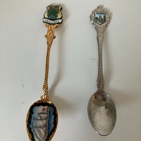 Souvenir ske fra Fredriksten Halden fæstning i Norge. Med tekst "Gud med oss", "Halden" og "Fredriksten Fæstning". 1 tårnet sølv P40. Længde 13,5 cm.