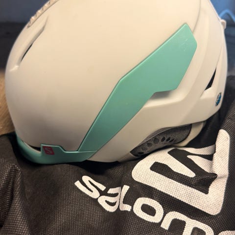 Salomon Grom White skihjelm med hvid farve. Str. M. Hjelmen har et mærke foran i plasticen. Hjelmen har ventilation og polstring indvendigt for komfort.