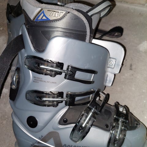 Nordica Dobermann R 3 skistøvler i størrelse 25,5. Farverne er grå og sort. Skistøvlerne har fire spænder og er designet til alpinski.