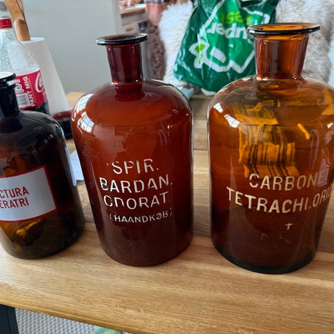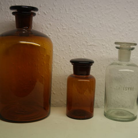 Apotekerflasker i forskellig størrelse i brunt glas. Nogle med “håndtag” i glasset. Nogle med låg.