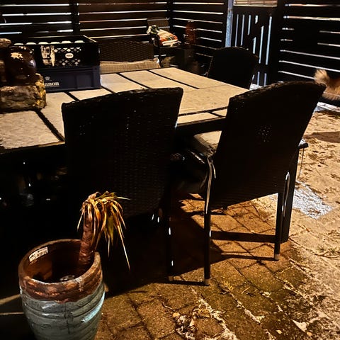 Sort havemøbelsæt med bord og stole i flet og metal