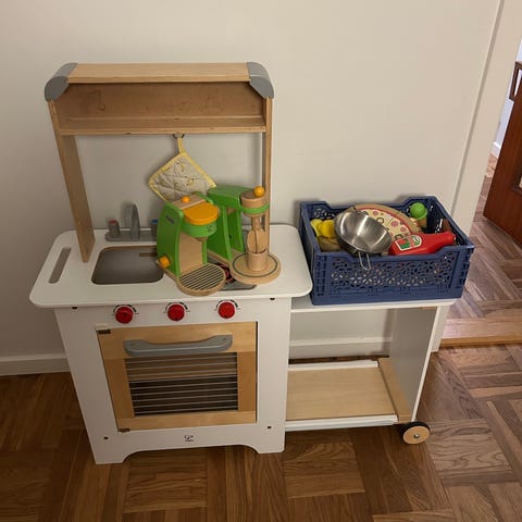 Hape legekøkken med komfur, ovn, vask og opbevaringsrum. Legekøkkenet har drejeknapper, en ovnlåge der kan åbnes, samt hylder til opbevaring. Designet i træ og malet i hvid og rød farve.