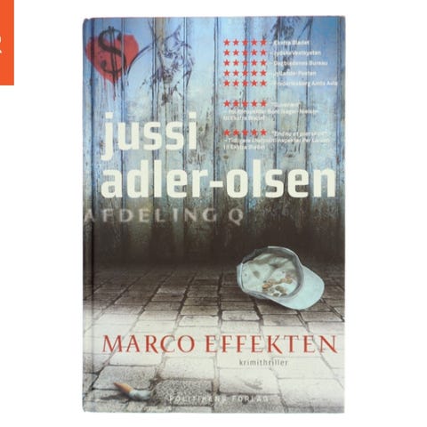 Marco effekten , Jussi Adler-Olsen , genre: krimi og spænding, Krimi. Den 15-årige Marco flygter fra sin voldelige og kriminelle klan. Klanen vil gøre det af med ham, og det er der også andre, der vil, for Marco er faldet over en hemmelighed, der har med korruption at gøre. Vicekriminalkommissær Carl Mørck og co. er i gang med korruptionssagen og krydser Marcos veje