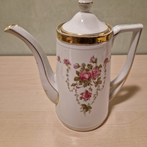 Rigtig sød kaffekande med blomstermotiv. Den har desværre et par revner (se I de blå cirkler). Men man skal helt tæt på for at man kan få øje på dem