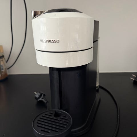 Nespresso kaffemaskine i hvid farve. Maskinen er designet til at brygge kaffe med Nespresso-kapsler, kan hentes på Frederiksberg eller Christianshavn (: