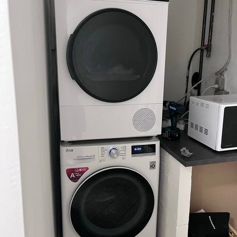 Mile vaskesøjle bestående af en kondenstøretumpler 8 kg i fornuftigt stand lidt gullig i lågens inderside plastik men har ingen betydning for dens funktioner kan køre fugtstyrede programmer og tidspogrammer