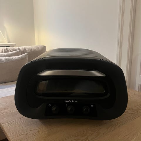 Nordic Sense Elektrisk Pizzaovn i sort farve. Denne ovn er designet til bagning af pizza og fungerer som en elektrisk ovn. Den har en front med betjeningsknapper og et vindue til at se ind i ovnen under brug.