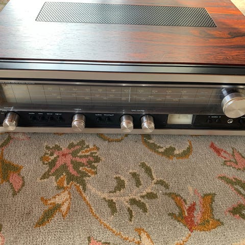 Polyphone vintage radio modtager med audio out port. Enheden har et klassisk design med en kombination af sort og hvid farve. Radioen har en drejeknap til tuning og en skala til indstilling af frekvenser. Den er lavet med metalgitter på fronten og plastmateriale på bagsiden, hvor batterirummet er placeret.