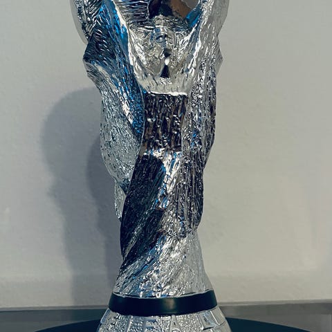 FIFA VM fodbold pokal som dekorationsobjekt med en højde på ca. 36 cm. Pokalen er sølvfarvet og har detaljer, der efterligner det originale design. Egnet til udstilling eller samling.