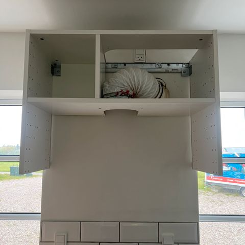 Køkken emhætteskjuler / emhætteskab i grå farve lavet af egetræ fra Handcrafted Interior. Emhætten har en firkantet form og er designet til montering på væg over kogeplade hvori der indsættes en emhætte.