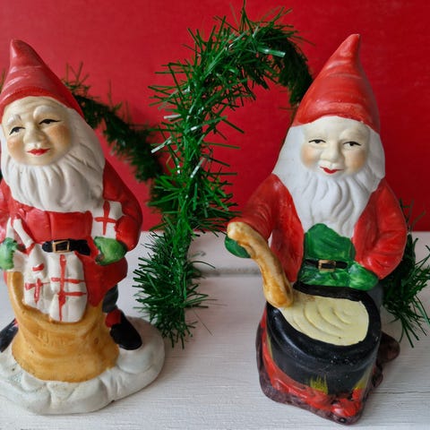Sæt med julefigurer bestående af nisser i rød dragt. Den ene spiller forskellige musikinstrumenter, den anden leger med et tog. Figurenes detaljer omfatter tromme, violin og klokker. Lavet i ler/terracotta. Egnet til juledekoration.
