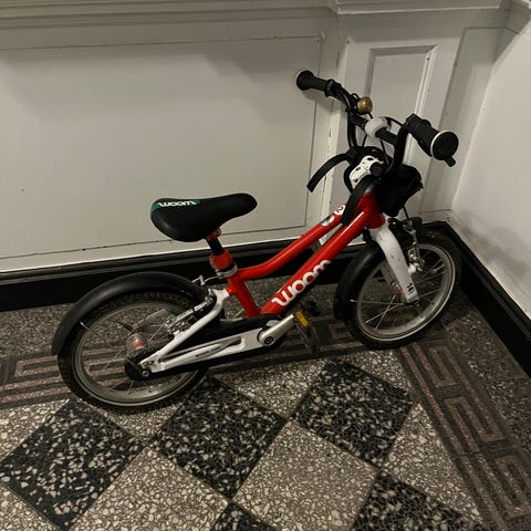 Flot Woom 2 børnecykel med 14" hjul i blå og hvid. Velegnet til børn i alderen 3–4,5 år / højde 95–110 cm. Cyklen har stået inde og er passet godt på. Den kører fantastisk!