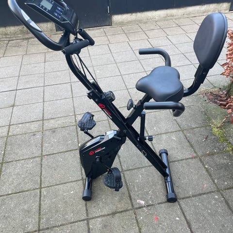 In shape motionscykel med digitalt display til visning af tid, hastighed og andre træningsdata. Cyklen har justerbart sæde og pedaler med remme. Velegnet til indendørs konditionstræning.