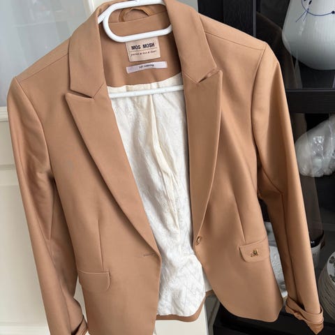 Mos Mosh grøn blazer og bukser til kvinder i størrelse 42. Sættet er fremstillet i elastan, hvilket giver fleksibilitet og komfort. Blazeren har knaplukning og lommer, og bukserne har en klassisk pasform. Velegnet til formelle og daglige brug.