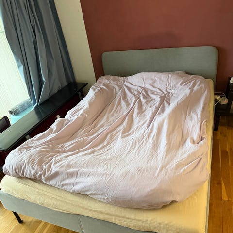 IKEA KLEPPSTAD sengestel i størrelsen 140x200 cm med hvid ramme og beige hovedgærde, som er nyvasket.